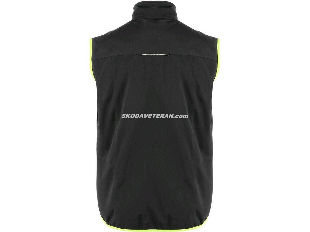 Lehká softshellová propínací vesta s reflexními výpustky, bez TPU, spodní lem do gumičky, 3 venkovní kapsy na zip a 3 vnitřní kapsy, dvoubarevné zipy.